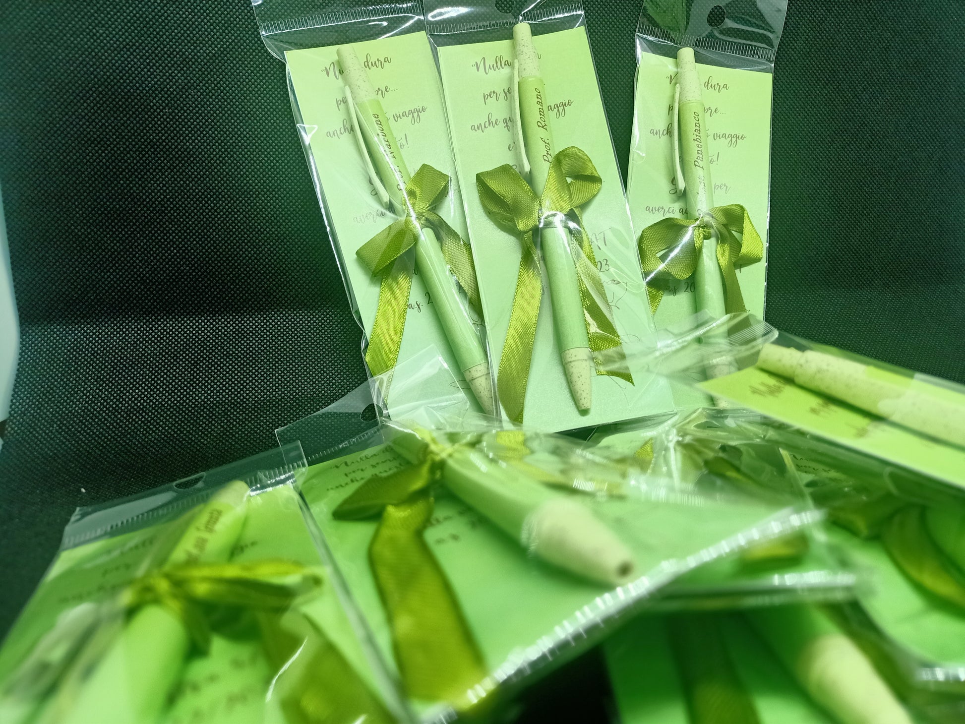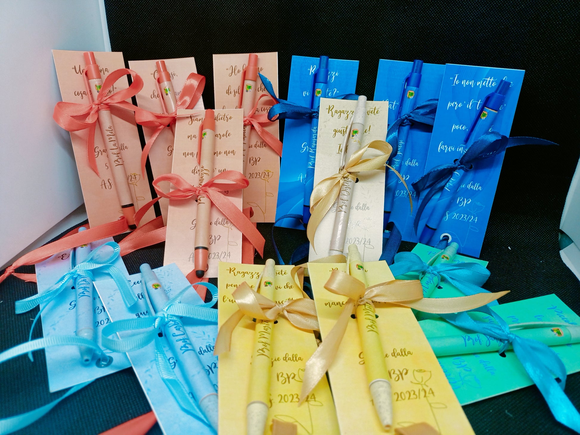 Scorrevolissima penna inchiostro nero con stampa su corpo in carta lucida, adatta anche per regalo ai professori di fine anno, o come dopofesta per un party o laurea. Parti in plastica in diversi varianti di colori. Confezione ordinabile a parte, segnalibro abbinato ordinabile a parte