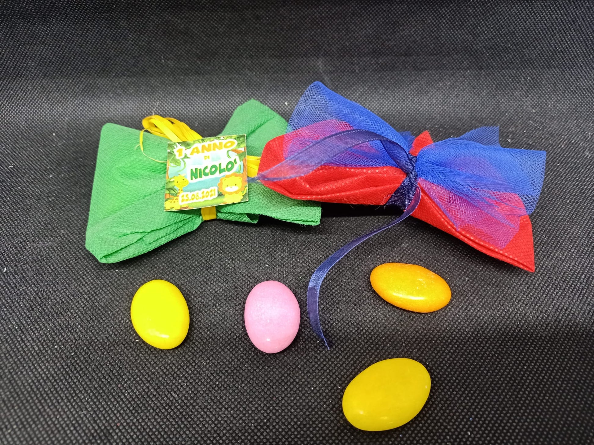 Carinissimo sacchettino a forma di papillon con confetti e lentine di cioccolato (smarties) in tulle, velo e TNT, compreso di bigliettino personalizzato con nome evento e data, per tutti i gadget che produciamo, anche per quelli che avete voi! Ordinabile nei colori che si abbinano ai vostri gadget. Valorizza al massimo il tuo gadget personalizzato. Il prezzo del gadget non è compreso